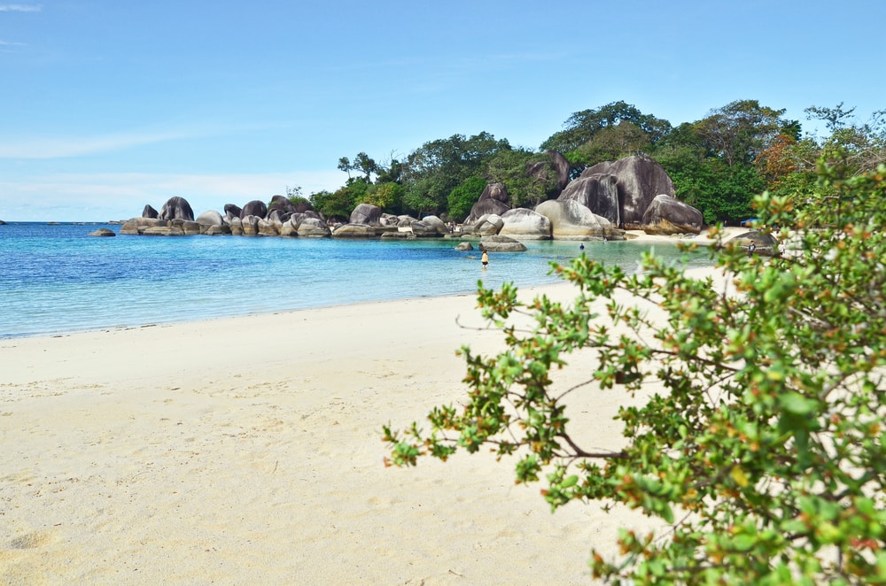 Perpaduan hamparan pasir putih, batuan granit, serta air laut yang tenang menjadikan pantai ini tampak istimewa.
